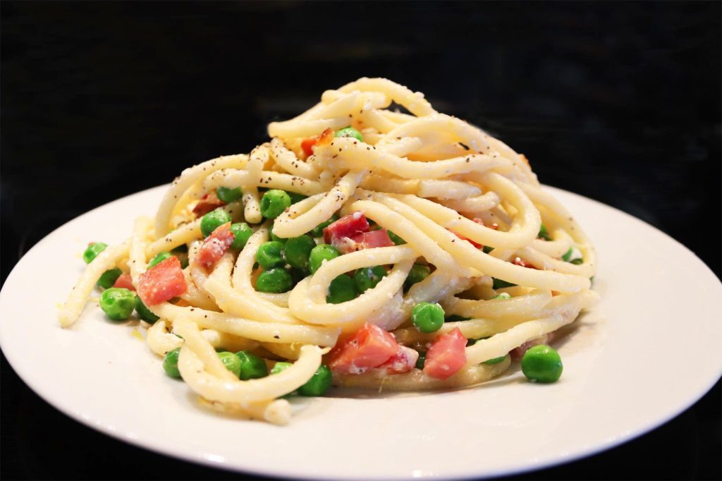 Bucatini with Sweet Peas, Ricotta and Smoked Ham