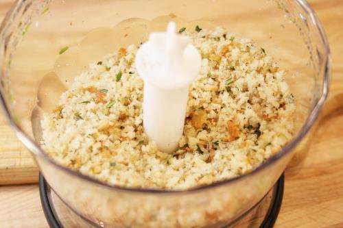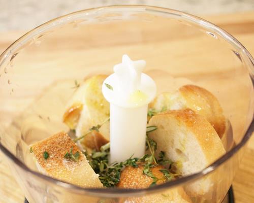 - Cut 3-4 slices day old baguette and add to a food processor. Add the leaves from 1 sprig rosemary leaves (or 1/2 tsp dried), 2-3 sprigs fresh thyme leaves (or 1 tsp dried) and 2-3 tbsp olive oil and season with kosher salt and freshly ground black pepper.