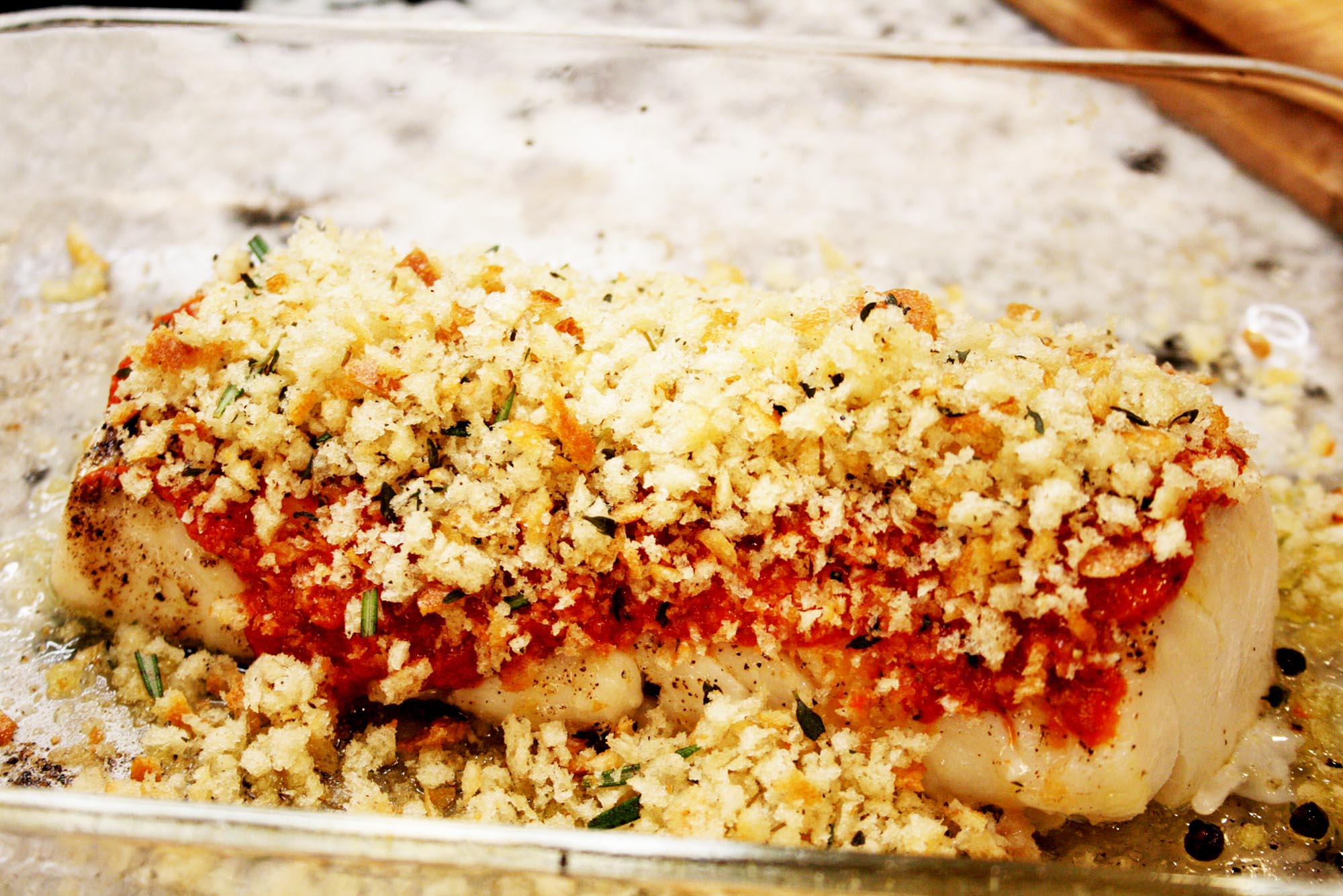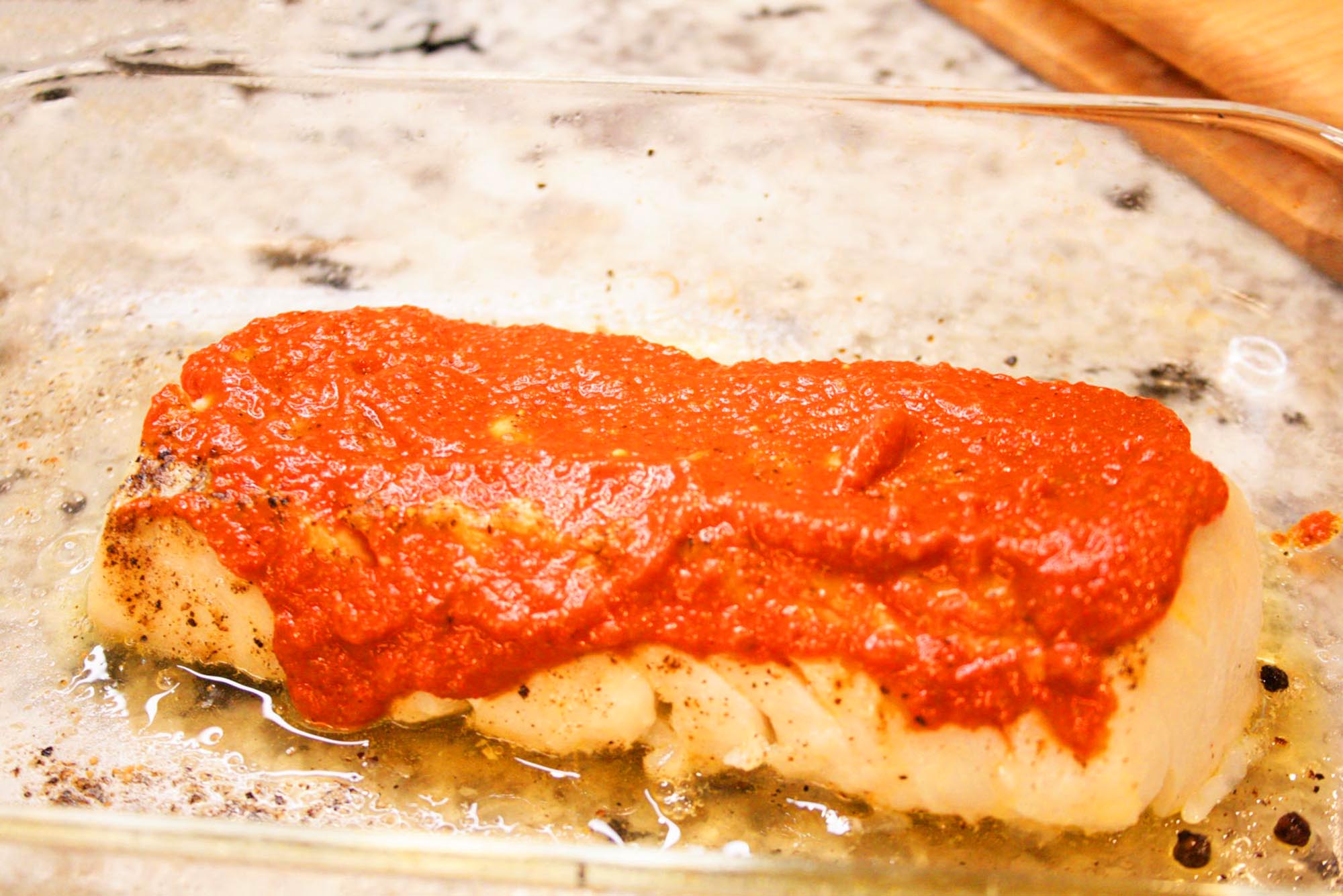 - Remove cod from the oven and spread fresh puttanesca sauce over the top of the cod fillets.