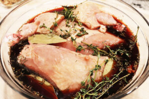 - Cut 1 whole chicken into 8 pieces or use 2 bone-in skin-on chicken legs and breasts and add to a large glass bowl. Add 2 cups good red wine, or enough to barely cover, 4-5 sprigs fresh thyme or 2 teaspoons dry and 2 whole bay leaves. Cover with cling wrap and refrigerate for 1-2 hours, turning once.
