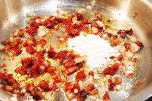 - Remove chicken to a platter and add 1 large shallot, finely chopped and when the shallot starts to soften, about 2 minutes then add 2 tbsp tomato paste and 2 tbsp all-purpose flour and stir until combined. Cook for 2-3 minutes stirring constantly.