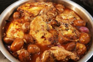 - Transfer the chicken pieces to the skillet nestling between the mushrooms and onions and then cover with a tight-fitting lid and place in a pre-heated 350℉ oven on a cookie sheet and bake for about 45 minutes. Check the mixture periodically, if the mixture looks a little dry, add a bit more wine or beef stock.