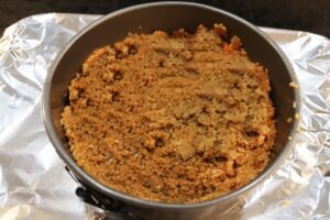 - Scatter crumb mixture evenly on the bottom and sides of a 7 inch deep sided spring form pan with removable bottom. Using a straight-sided glass or dry measuring cup, firmly press crumbs on bottom and against sides of pan.
