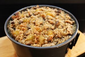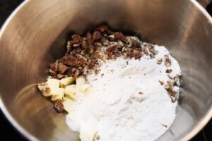 - Combine 1/2 cup cubed unsalted cold butter ,1/2 cup chopped walnuts, 2 tbsp brown sugar, 3 tbsp sugar, 6 tbsp flour, pinch of cinnamon and kosher salt each and and toss until the butter is evenly coated.