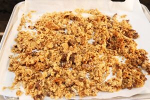 - Spread crumble topping on a parchment lined baking sheet and place in a preheated oven and bake for 20-25 minutes or until the topping looks golden.