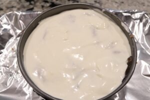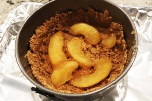 - Top the set cheesecake with dollops of apple pie filling, then top with crumble topping.