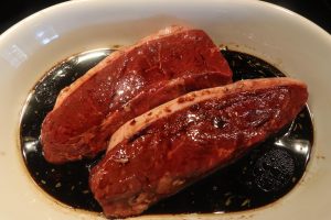 - Remove steak from refrigerator and marinate 1 8 oz cap steak/person for at least one hour before grilling/searing.