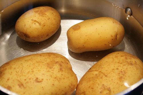 - Cover 3 whole potatoes in a deep pot, bring to a boil, reduce to a simmer and for 20-25 minutes or until a paring knife slides through potatoes. Drain and let cool.