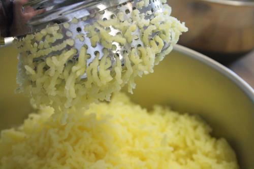 - Peel potatoes and press through a ricer, or mix with a fork until all the lumps have been removed. The potatoes should be light and fluffy and not like a paste.