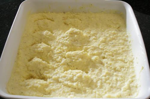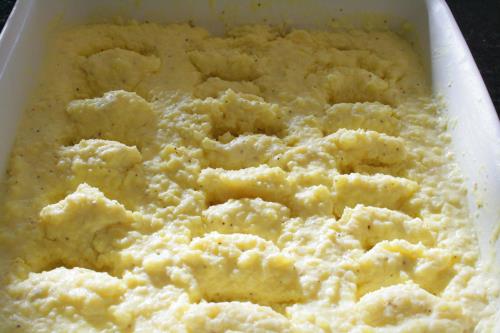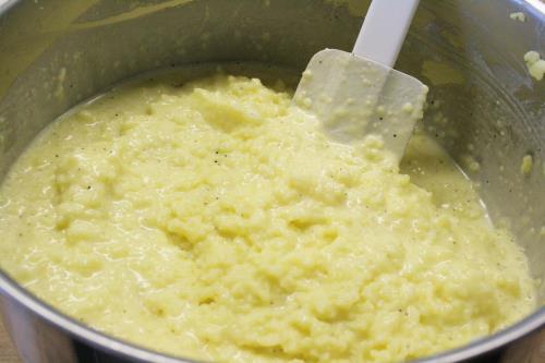 - Fold the potatoes gently into egg cream mixture, do not over mix.
