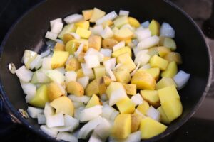 - Heat 1 tbsp olive oil in a small skillet over medium high heat. Add 1 large parboiled Yukon gold potato, cut into cubes and 1/2 medium chopped onion and stir to combine.