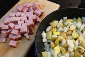 - Cut smoked ham into cubes the same size as the potatoes.