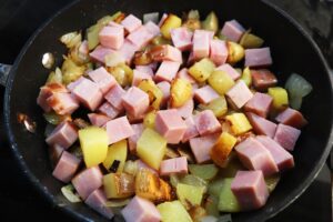 - Add cubed ham to potato mixture when the onions have softened and are beginning to brown, about 5-6 minutes and cook until the ham has warmed through and is beginning to brown around the edges.