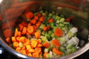 - Add 1 tbsp olive oil to a medium sized stock pot over medium heat. Add 1/2 medium chopped onion, 2 small carrots, sliced, and 1 stalk chopped celery and stir to combine. Sauté until the onions become soft, about 4-5 minutes.