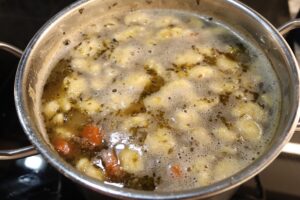 - Taste for seasoning and add kosher salt and freshly ground black pepper if needed then bring the soup back to a fast simmer and pinch small snippets of the dumpling dough into the soup, cook until the dumplings all float to the top.