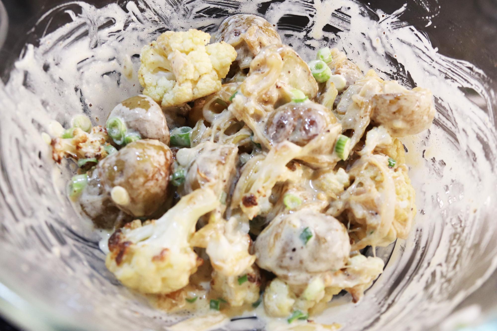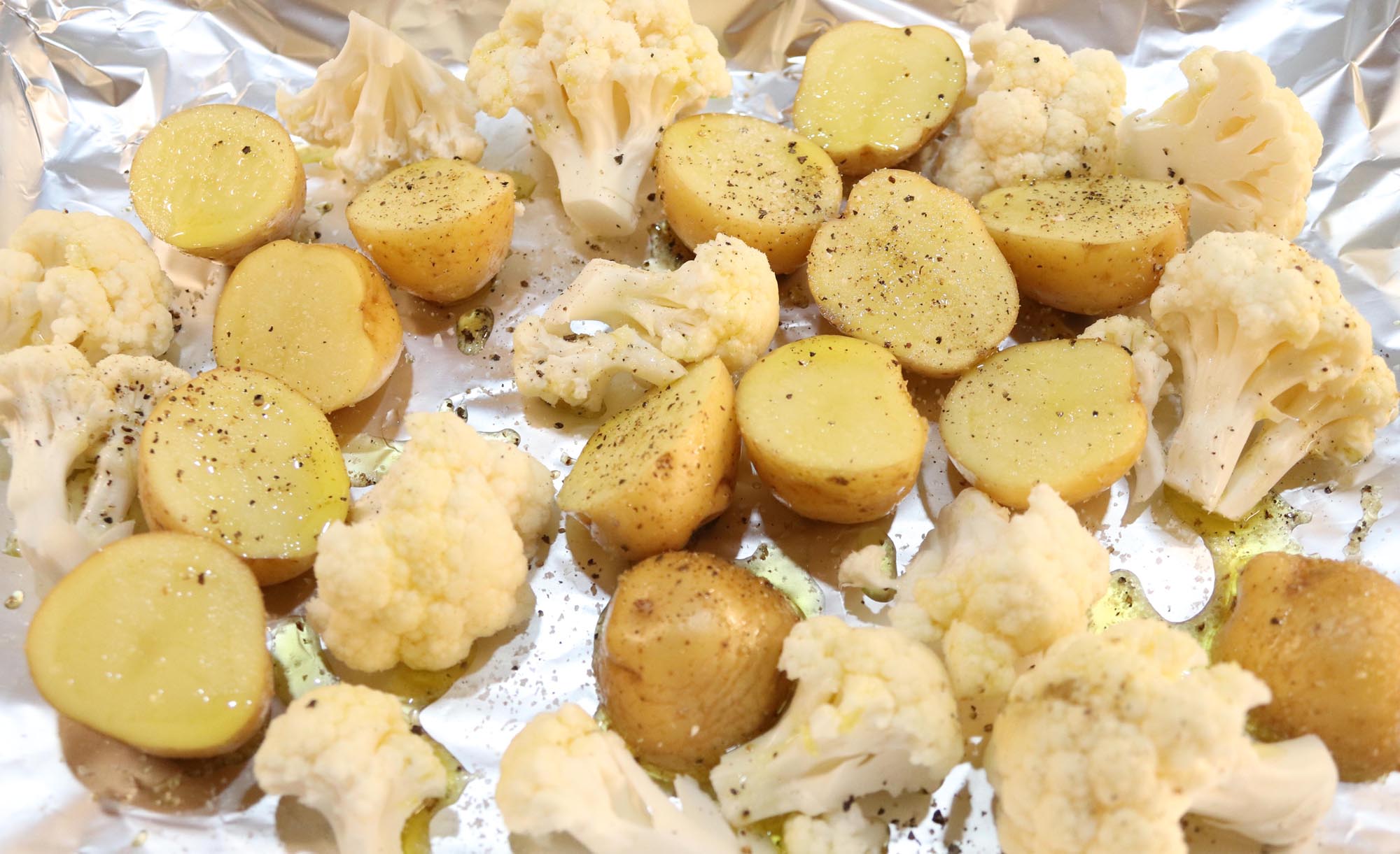 - Line a sheet pan with parchment paper or non stick aluminum foil and add 6-8 baby Yukon Gold or red skinned potatoes, sliced into halves, 1/3 medium head cauliflower florets and add a drizzle of olive oil. Season well with kosher salt and freshly ground black pepper and toss to combine.