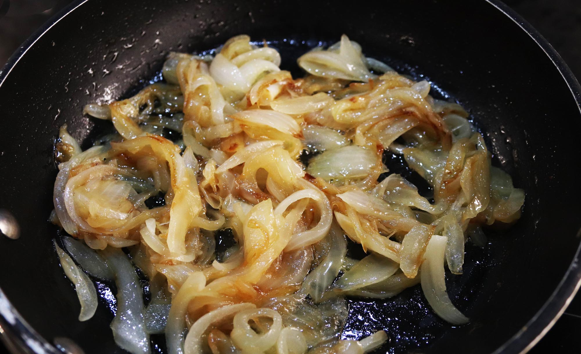 - Add two more tablespoons of water and reduce heat to low. The onions will begin to turn golden while cooking. Stir occasionally and add more water if it evaporates. Cook until the onions turn a dark brown, about 15-20 minutes.