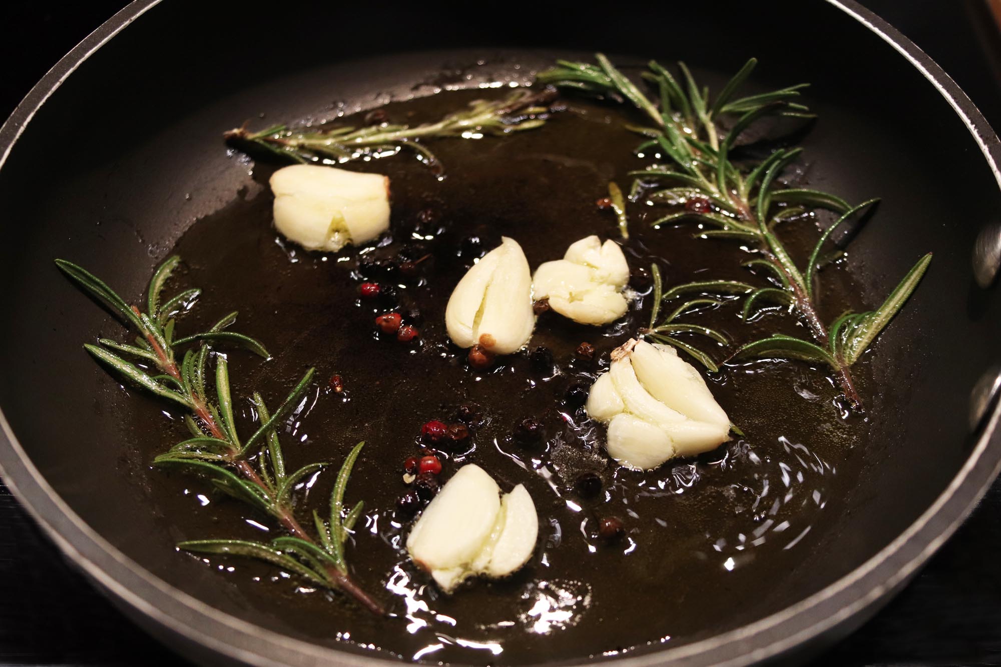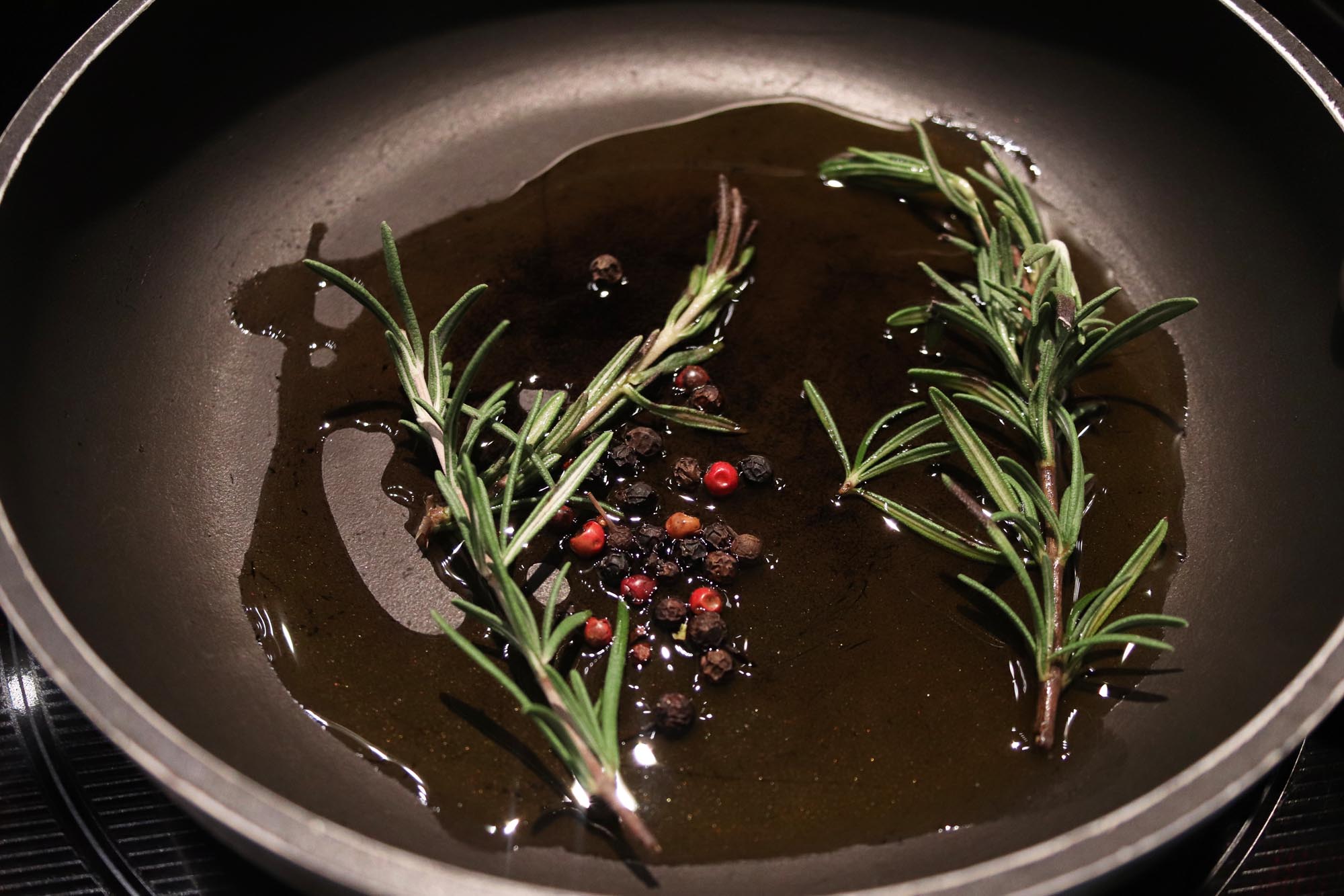 - Heat 1 tbsp olive in small skillet over medium heat and add 2-3 sprigs fresh Rosemary and 1 tsp mixed black and red pepper corns.