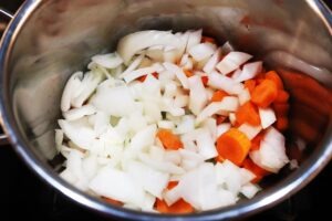 - Add 1 medium carrot, peeled and sliced and 1 medium chopped onion to the butter and sauté until the vegetables are soft, about 4-5 minutes.