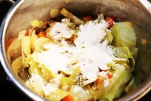 - Sprinkle 1 tbsp flour on the cooked vegetables and stir to combine.