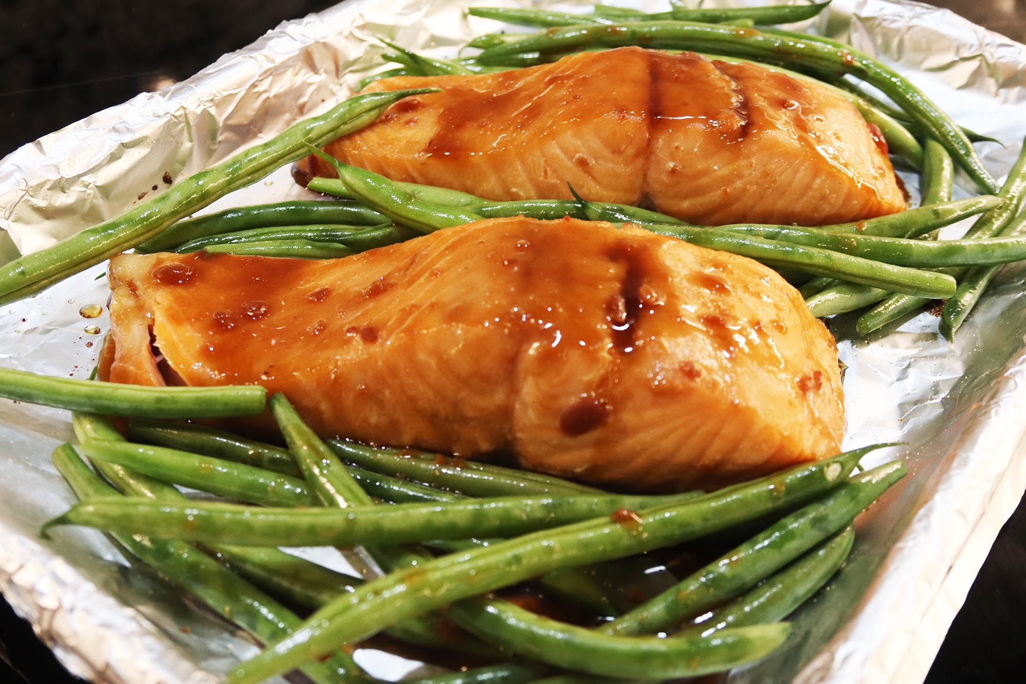 - Rinse 1 package green beans under running water, then add to nonstick aluminum lined sheet pan. Drizzle with 1/2 tsp sesame oil, season with kosher salt and freshly ground black pepper and toss to combine. Remove salmon from marinade and place the filets on a nonstick aluminum lined sheet pan.