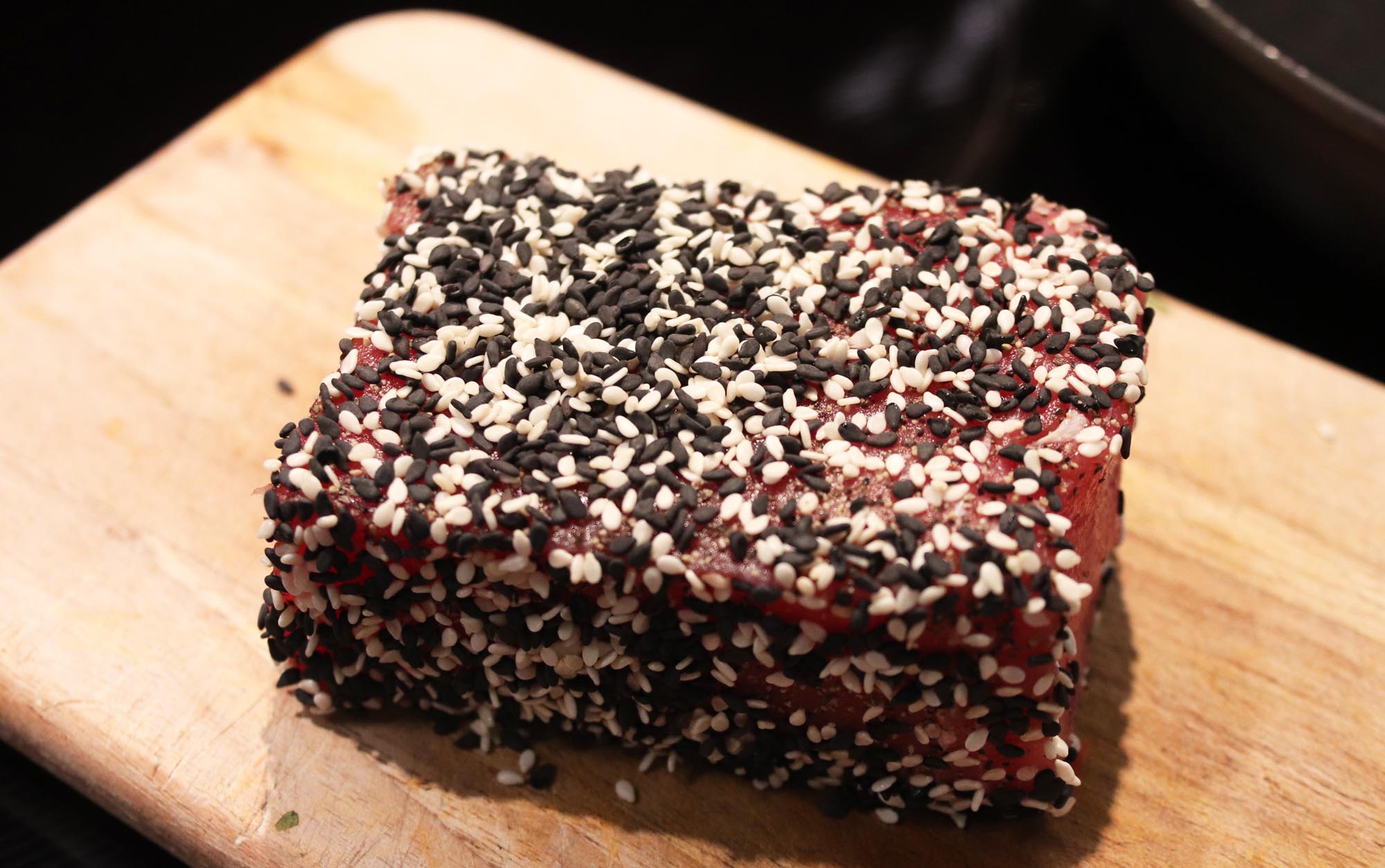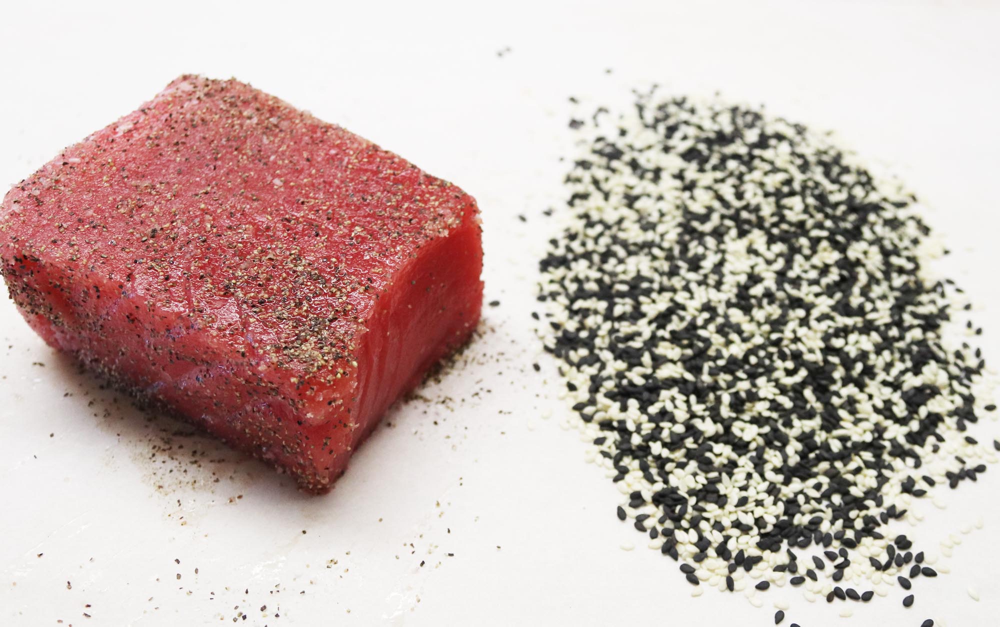 - Season tuna with kosher salt and freshly ground black pepper and mix 1 tbsp black sesame seeds and 1 tbsp white sesame seeds together.