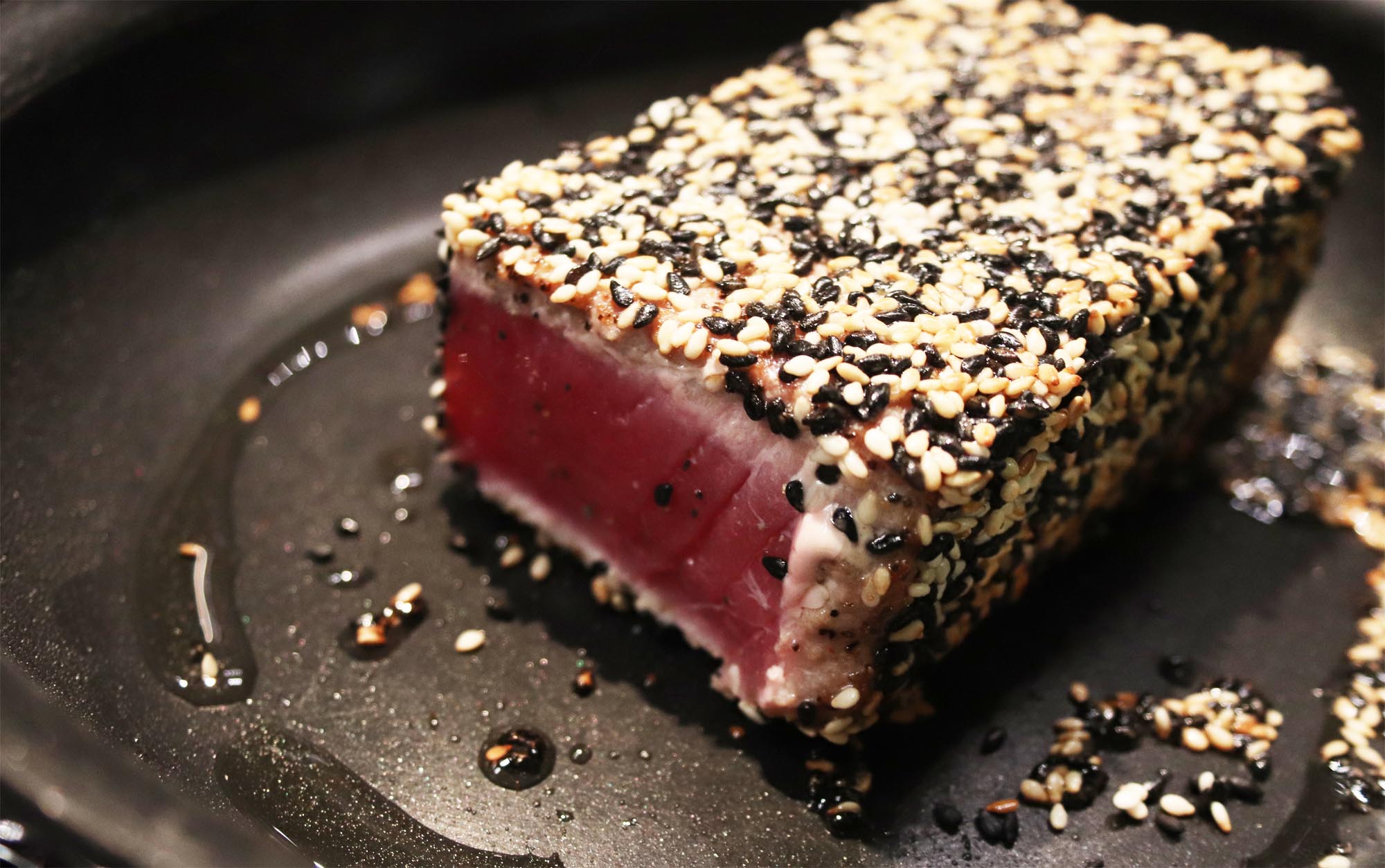 - Add tuna on one seed encrusted side and sear until an 1/8" thick white band appears on the side being seared. Check after 30 seconds, then turn the tuna to the next side and sear each side until all sides have formed a white rim. Do not sear the ends. Note that searing the tuna literally takes seconds, so stay close and keep checking the uncoated side!