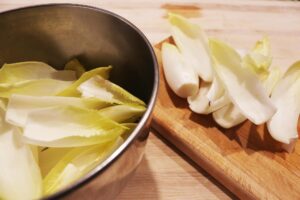 - Trim 2 head endive ends until the endive leaves can separate. You may have to do this several times as you get closer to the middleof the endive.