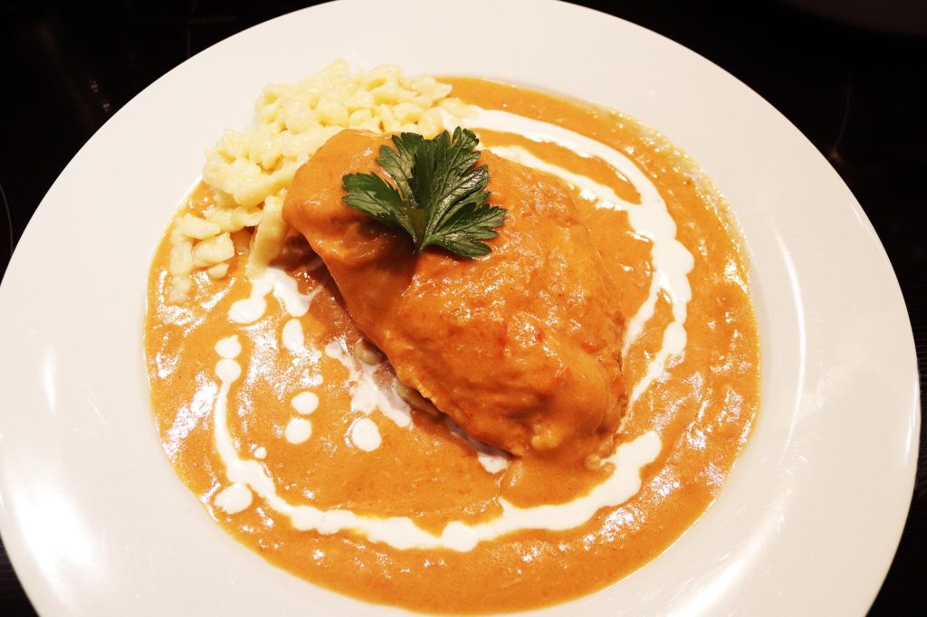 Beef and pork paprikash will take longer to cook, and are more stew like. I would describe these two dishes as hearty and so I tend to make them in the fall and winter. These dishes will also have a more intense flavor and a thicker natural sauce due to the hour or two that it takes to cook. I like to serve these dishes with a side dish of plain boiled potatoes or a pasta, such as pappardelle.